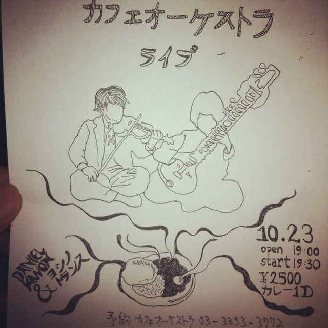 美味しいカレーのお店 カフェオーケストラ でのフォーク&シタールライブがあります! カレードリンク付き! 日程:10月23日火曜日 場所: 西荻窪カフェオーケストラ live: DANIEL KWON/Vo,G,vio http://www.webvanda.com/2010/07/post_12002814.html YOSHINO (RagaFolk)/シタール, from TRANKO 開場:19:00 開演:19:30 料金: 2500 (カレー+1d付) 予約制15人限定 (予約) 03-3333-3772 オーケストラ or cosmic-slop@mail.goo.ne.jp まで 西荻窪カフェオーケストラ 03-3333-3772