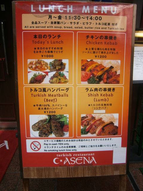 10月23日(火)の女子会ランチはトルコ料理でーす 以前見つけたトルコ料理のお店の予定でしたが・・・ 12日のランチの帰り道に見つけたトルコ料理のお店にしました アセナのランチメニュー ランチタイムの営業時間:11:30〜14:00(月〜金) ※ランチタイムは全席禁煙 全品スープ、自家製パン、サラダ、ピラフ、トルコチャイ付き 上質な子羊肉をジューシーにシシケバブ ラム肉の串焼き 1,800円 牛挽肉100%の旨味がぎゅっと詰まっていますキョフテ 牛挽肉のトルコハンバーグ 1,200円 特製ソースに一晩漬