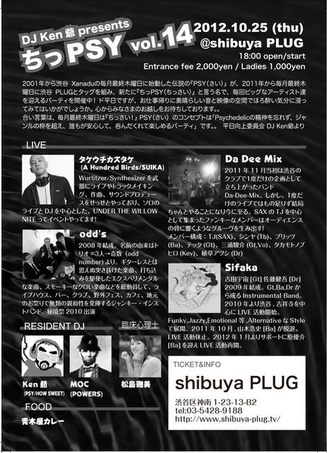管理人さま、お邪魔します! 2001年から渋谷Xanaduの毎月最終木曜日に始動した伝説の『PSY (さい)』が、2011年から毎月最終木曜日に渋谷PLUGとタッグを組み、新たに『ちっPSY (ちっさい)』と言う名で、毎回ビッグなアーティスト達を迎えるパーティを開催中! ド平日ですが、お仕事帰りに素晴らしい音と映像の空間でほろ酔い気分に浸ってみてはいかがでしょうか。 心からみなさまのお越しをお待ちしております。。 合い言葉は、毎月最終木曜日は『ちっさい!』 PSY (さい)のコンセプトは「Psychedelicの精神を忘れず、ジャンルの枠を超え、