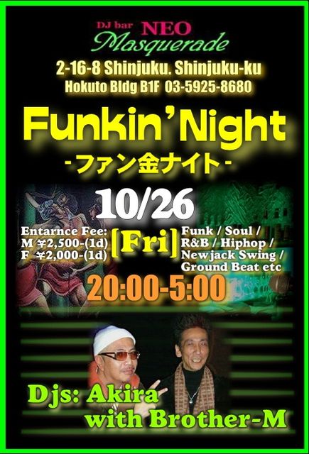 お馴染みになりつつある新宿2丁目ネオマスの黒い金曜Black Fridayですが、 8月4週からは「黒金」から「ファン金」へと看板を架け替えまして、よりドス黒 くFunkyな空間を目指してやっております! 8月・9月のGuest Djには、ファンラジ やファンクアタックでお馴染みのDj Terry Ohno兄をお迎えしてお送り致しました☆ 10月4週目のGuest Djは、ナバーナや六本木Classics等でお馴染みDj AKIRA氏 が登場!Brother-Mとのジョイントで真っ黒な夜にします☆ 是非ぜひ遊びに 来てくださ〜ぃ!ちなみにAKIRA氏とBro-Mは業界で一