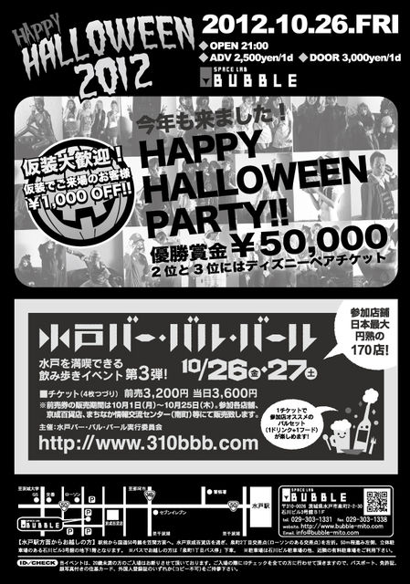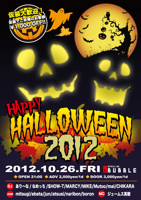 毎年、好評を博したBubbleのハロウィンパーティーの開催です!!! 年々グレードアップされる仮装、そして内装にも期待!!! 恥ずかしがらず是非仮装でのご来場をお待ちしております。 今年は優勝賞金"5万円!!!!"そしてディズニーペアチケットと豪華賞品が並んでおります!!! DJ陣もALL MIXとどの時間もみんなを楽しませてくれる事は間違いない!!! 最高の一夜をみんなでエンジョイしよう!!! 【HAPPY HALLOWEEN 2012】 2012 / 10 / 26 (FRI) OPEN; 21:00 ADV(前売り) ¥2,500/1D DOOR(当日) ¥3,000/1D 仮装でご来場