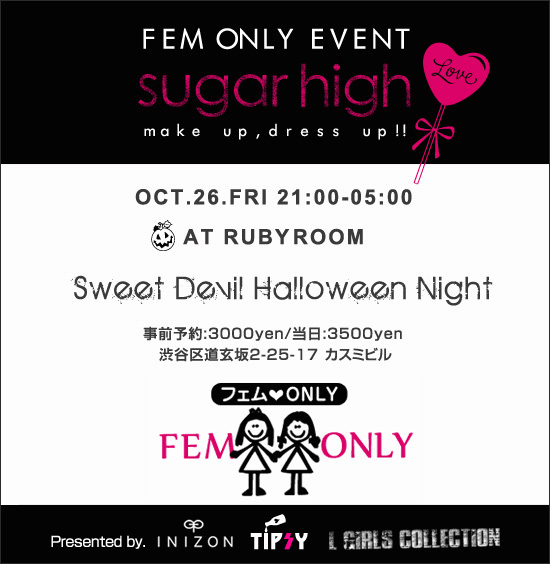 レズビアンイベント「TIPSY」を主宰しているINIZONが新しいパーティーをSTART!! フェム×フェム至極主義が心底楽しめる!! フェムONLYのハロウィンパーティー♪ SEXY & CUTEな小悪魔Girls大集合 メイクしてオシャレしてGirls Night Out パーティー詳細⇒http://tipsy.chu.jp/night/next.html 2012.10.26 (Fri) Sweet Devil Halloween Night @RUBY ROOM in SHIBUYA 東京都渋谷区道玄坂2-25-17 カスミビル ◆アクセスこちら⇒http://ameblo.jp/sugarhigh-fem/entry-11361014013
