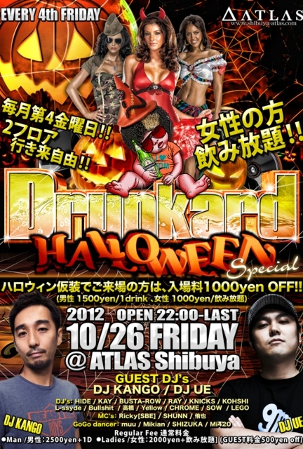 10/26[金]大好評!!女性飲み放題のHIPHOP PARTY "Drunkard"-Halloween Special-@ATLAS 渋谷 エントランスにて『DJひでのゲストでハロウィン』と 言っていただければ仮装してなくてもゲスト料金にて ご入場いただけます!! ★ハロウィンスペシャル開催★ 華の金曜日に思い切りお酒を飲んで遊びたい方にオススメ!! 毎月第4金曜日に渋谷の大御所"club axxcis "の姉妹店"ATLAS@渋谷 B1F/2F 2フロアにて開催しているHIPHOP PARTY。 毎回豪華なGUEST DJを迎え、渋谷・六本木・横浜など各地のBIG PARTYを盛り上げているDJ,MCが、今Hotな
