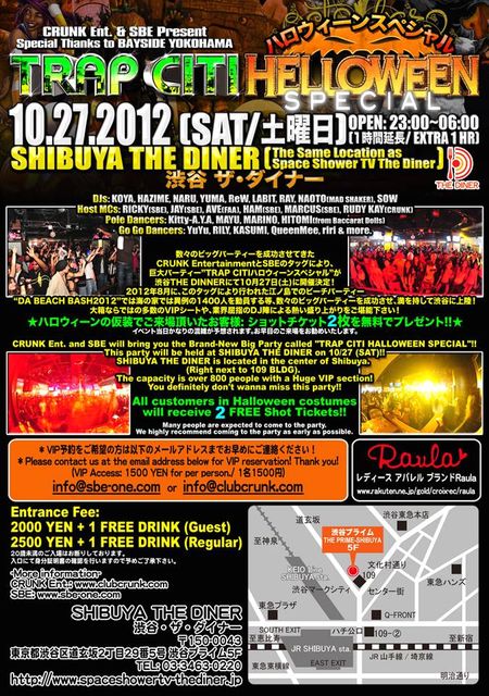 (10/27 SAT) TRAP CITIハロウィーンスペシャル/ HALLOWEEN SPECIAL (@ SHIBUYA THE DINER) ★ハロウィーンの仮装でご来場頂いたお客様: ショットチケット2枚を無料でプレゼント!! フライヤー画像は下記URLより http://photo.mixi.jp/view_photo.pl?photo_id=1788585574&owner_id=2508960 会場地図は下記URLより http://photo.mixi.jp/view_photo.pl?photo_id=1794912092&owner_id=2508960 前回開催時の写真 http://photo.mixi.jp/view_album.pl?album_id=500000055479885&owner_id=2508960