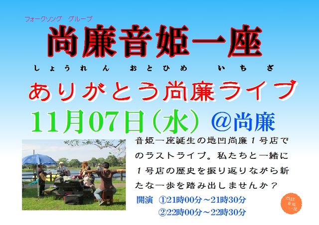 11月10日をもって閉店および移転する 「尚廉1号店」 それぞれが あの凹トビラを開けた時から始まった・・・ 想い出深いこの1号店で最後のライブとなりました。 ここで生まれた「尚廉音姫一座」 素晴らしいバンド名を頂き2年が過ぎました。 これまでの御礼と感謝の意を込めて 「ありがとう尚廉」と題し ライブをやらせていただく事になりました。 演奏時間(20〜30分) ? 21:00〜 ? 22:00〜 皆様のご来店お待ちしております♪