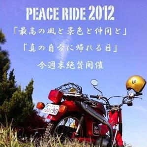 PEACE RIDE 2012 11月03日(土)10:00〜14:00 南阿蘇村 あそ望の郷くぎの 芝生広場 雄大な南阿蘇をバックに、様々なジャンルのバイクが一同に集まる日。 原付でも、リッターバイクでも、 新車でも、旧車でも、 アメリカンでも、スーパースポーツでも、 国産でも、外車でも、 オールジャンルでフリースタイルに楽しめる。 それが、ピースライド。 交わすピースで、気持ちも交わそう! ピースサインもお忘れなく。 仲間を募って来られるもよし お忍びで来られるも良し 現地でお会いできると良いですね。 台風の影響で