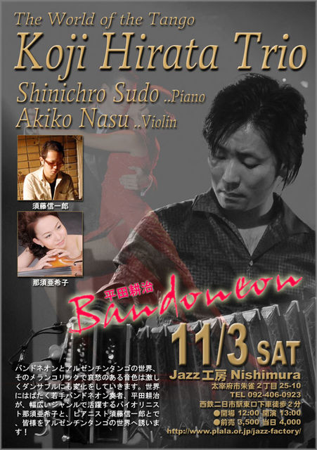 世界にはばたくバンドネオン奏者、平田耕治が幅広いジャンルで活躍するバイオリニスト、那須亜希子とピアニスト、須藤信一郎とで、