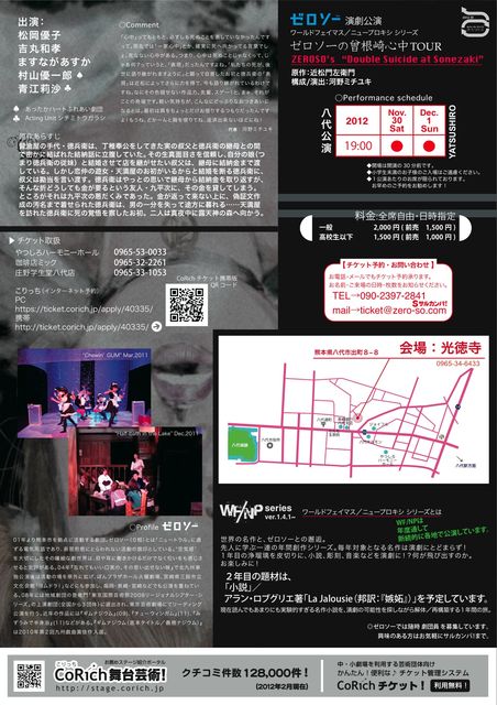 今年6月から上演しています「ゼロソーの曾根崎心中」! 早川倉庫(熊本公演)→豊前街道南関御茶屋跡(南関公演)と来て次は八代 光徳寺さんの本堂で上演させていただきます!! 民話で有名な彦一さんのお墓がある光徳寺さん。 お寺の本堂の空気の中、曾根崎の世界を描くことに相当にメンバーもワクワクしています! 一度、ご覧になった方も、熊本公演、南関公演と経て「ゼロソーの曾根崎心中」かなり変化を遂げています。 ぜひぜひご覧下さいませ☆☆☆☆ ****** ワールドフェイマス/ニュープロキシ シリーズ 『ゼロソーの曾根崎心
