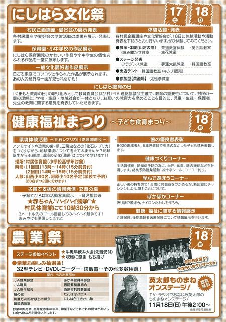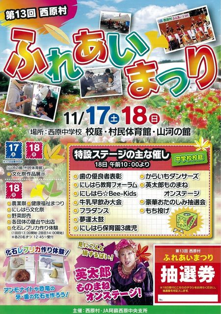 ---------------------------------------------------- 「第13回 西原村 ふれあいまつり」 11/17(土)18(日) @西原中学校校庭・村民体育館・山河の館 ※催しなど詳しくはチラシをご覧下さい。 ※英太郎のものまねショーは11/18(日)14:00からの予定です。 ---------------------------------------------------- J太郎
