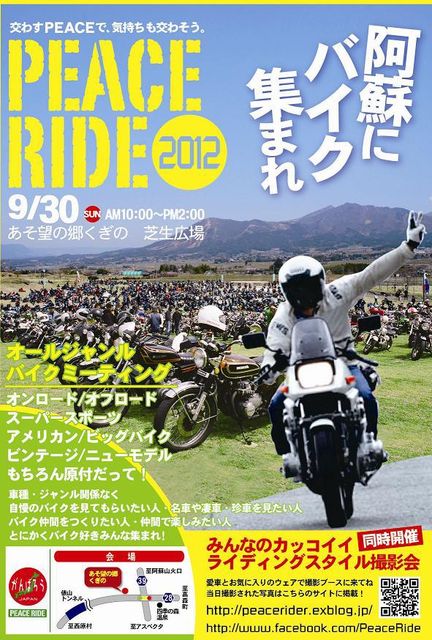 9/30から11/03に延期に成りました。 今年も開催されます。 興味ある方は参加! PEACE RIDE 2012 11月03日(土)10:00〜14:00*祝日文化の日 南阿蘇村 あそ望の郷くぎの 芝生広場 雄大な南阿蘇をバックに、様々なジャンルのバイクが一同に集まる日。 原付でも、リッターバイクでも、 新車でも、旧車でも、 アメリカンでも、スーパースポーツでも、 国産でも、外車でも、 オールジャンルでフリースタイルに楽しめる。 それが、ピースライド。 交わすピースで、気持ちも交わそう! ピースサインもお忘れなく。 仲間