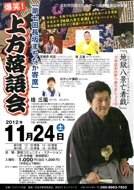 長坂まちなか寄席『爆笑!上方落語会』も今回で7回目になりました 今回は、大阪でもなかなか披露されない上方落語の大ネタ 『地獄八景亡者戯』をフルバージョン、生のお囃子ありで 桂 三風師匠にご披露いただきます 日 時 平成24年11月24日(土曜日) 昼の部 13:30開場 14:00開演 夜の部 17:30開場 18:00開演 会 場 長坂コミュニティ・ステーション(JR長坂駅すぐ) 入場料 前売り1,000円(当日1,200円)