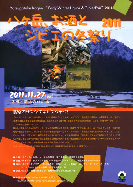 会 場/萌木の村広場(屋外、雨天でも開催) 内 容/ *地域内ホテル・飲食店によるジビエ(狩猟による野生鳥獣肉)料理・他の販売 *地元の猟師のみなさんの協力による「イノシシ鍋」(有料) *山梨県内の酒造メーカー(ワイン・地酒・地ビール・ウィスキー)による試飲と販売 *焚き火を利用した「焼き芋」「マシュマロ焼き」などの無料提供 *鹿の解体ショー(予定)・バンド演奏などのアトラクション *萌木の村木工房によるトナカイ製作体験と販売 お申し込み・お問い合わせ/ホテル オールドエイジ(TEL.0551-48-2341) http:/