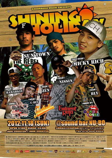 東京は浅草から、ダンスホールシーンに革命を起こし続けるシーンの火付け役として名高いアーティスト【MICKY RICH from ENT DEAL LEAGUE】が2年ぶりに播州に登場!!!! GUEST SOUNDには、ブレないSTYLEで全国各地の現場をBUSSし続け、播州のモンスター野外ダンス"BAM BAM播州音祭"でもお馴染みの【SUN TOWN】が!滅多にないこの豪華な組み合わせを絶対見逃すな!11/18は、sound bar NU-BOに全員集合だ!!!!