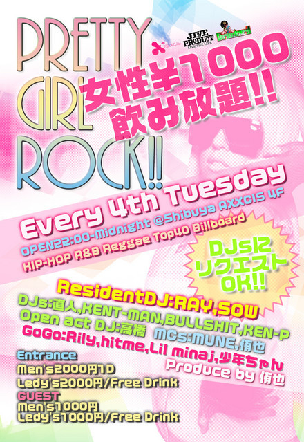 管理人様告知失礼致します。 [Event Info] 毎月第2・4・5週の火曜日に渋谷No.1大御所Club "club axxcis" 2/3/4階 全フロア解放にて開催!! "PrettyGirlRock" タイトル通りこのパーティーの主役は来て頂いた女性の皆様です!!!女性の皆様にお気軽に楽しんで頂ける様に、女性飲み放題にて開催! 渋谷・六本木・横浜等で数々のBig PartyをRockしてきたDJ.MC.Sexy GoGo Dancerが出演!!誰もが知っている往年の名曲から今「旬」な最新ヒットソングまで巧みなスキルとグルーヴで余すことなくPLAY!!クラブ初心者からクラブ好きまで幅広く楽しん