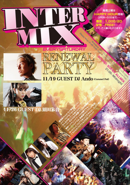 INTER MIX 11/26(土) GUEST DJ は須田朱音 メインフロアでは新旧問わないアガれる曲が中心のパーティーフロア 最新のビルボードヒットなどアゲチューンからしっとり聴ける R&B、HOUSE NATION、J-POP、TRANCEまでかかる オールジャンルスタイル でお送りしますグッド(上向き矢印)お立ち台も設置 そして!! 毎週都内で超人気の様々な人気美容室とタイアップした 無料へアアレンジブース も体験できます美容院 明日はOASIS ラウンジフロアでは都内で活躍中のDJが 今流行のHIP-HO