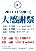 11月22日祝前日 CLUB ELF 大感謝祭 いつもご来店されている皆様に送るELFのスペシャルイベントになります 今回はなんと女性は終日入場無料、男性は終日1000円0ドリンクにて入場出来ます また、ウェルカムシャンパンやマシュマロ食べ放題など、嬉しいコンテンツもあり B2メインフロアでは新旧問わないアガれる曲が中心のパーティーフロア 最新のビルボードヒットなどアゲチューンからしっとり聴けるR&B、HOUSE、ELECT