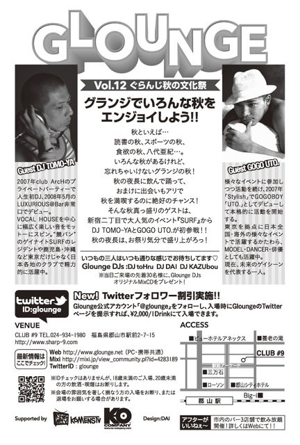 そんな秋真っ盛りのゲストは、新宿二丁目で大人気のイベント『SURF』からDJ TOMO-YAとGOGO UTO.が初参戦!!