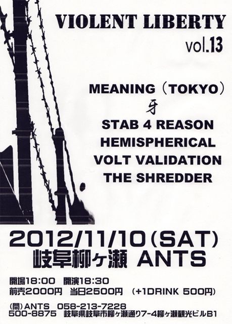 ■2012.11.10(SAT)@柳ヶ瀬ANTS 牙 Presents "VIOLENT LIBERTY Vol.14" ◆MEANING(東京) ◆牙(名古屋) ◆STAB 4 REASON ◆HEMISPHERICAL ◆VOLT VALIDATION ◆THE SHREDDER OPEN/18:00 START/18:30 チケット/前売り\2,000 当日\2,500 (別途Drink代500円)