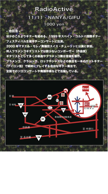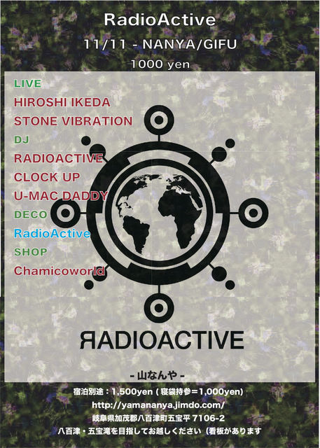 RadioActive 2012 11/10 (土曜日) OPEN 14:00 - START 20:00 UNTIL MORNING なんや/GIFU 1000ー 宿泊別途:1,500yen (寝袋持参=1,000yen) -山なんや- http://yamananya.jimdo.com/ 岐阜県加茂郡八百津町五宝平7106-2 八百津・五宝滝を目指してお越しください(看板があります LIVE HIROSHI IKEDA STONE VIBRATION DJ RADIOACTIVE HAYATO NISHIKEN U-MAC DADDY CLOCK UP TAKAO K DAIKE RYUMA DECO Radioactive SHOP Chamicoworld