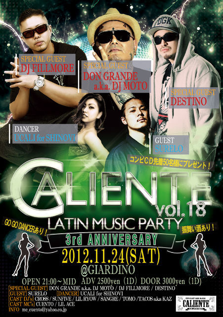 管理人様、告知失礼します。 不適切でしたらお手数ですが削除願います。 岐阜県は瑞浪市で開催中のLATIN MUSIC PARTY[CALIENTE] ついに3周年♪♪ 11月24日!! 内容半端なし!! 東濃でこの豪華メンツは貴重ですよ〜 確実に朝まで飲んで踊れる空間を提供します 皆さんのご来場をお待ちしております チケット等、ご不明な点はメッセージしてください チェーーック http://www.youtube.com/watch?v=sq4zm1upEx4&sns=em CALIENTE VOL.18 〜LATIN MUSIC PARTY〜 3rd ANNIVER