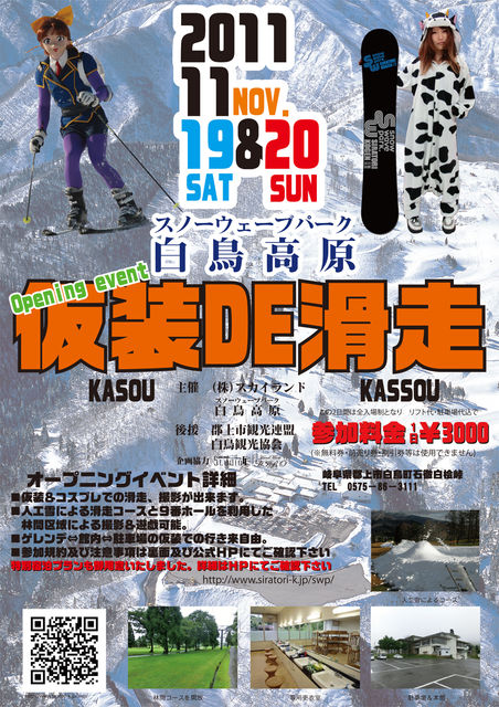 突然決まりました。 スノーウェーブパーク白鳥高原のコスプレ滑走行くんですが、一緒に滑りませんか? 【日時】 2011.11.20(日) 【集合場所】 スノーウェーブパーク白鳥高原 滑っていたら出会うはずさ 【詳細】 こちらをご覧ください http://www.siratori-k.jp/swp/ 日曜日に来る方、待ってまーーーすww
