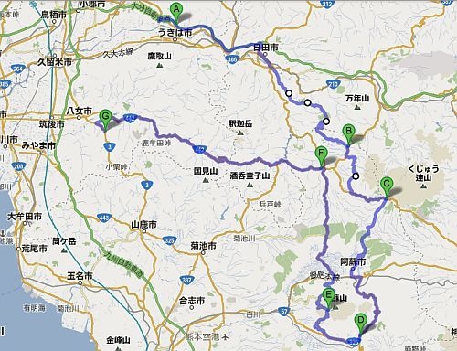 コミュでのマスツーは久しぶりになりますが、7月北部九州豪雨で被災した筑後および阿蘇地区の復興を応援するために、ツーリングを企画します。 詳細は下記のとおりです。ご参加をお待ちしています。 ・開催日: 平成24年11月3日(祝) ・集 合: 7:30 山田SA ・ルート: 日田〜ファームロード〜瀬の本高原〜高森〜阿蘇山頂〜大観峰〜小国〜八女 ・ランチ: らくだ山(高森)で「地鶏焼」 http://www.rakudayama.com/ ・解 散: 道の駅たちばな(八女) *阿蘇で開催されるピースライドが台風の影響で11/3