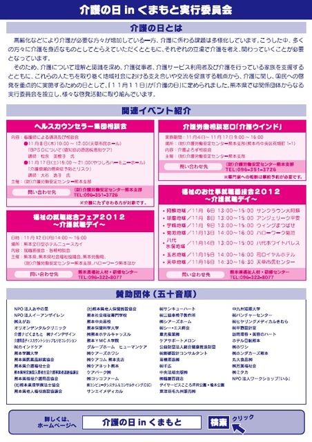 -------------------------------------------------------- 「介護の日 in くまもと 2012」 11/11(日)@市民会館崇城大学ホール 2階大会議室 11:30〜 ※入場無料 来場者には先着で「くまモングッズ」のプレゼントもあります。 (問)介護の日 in くまもと実行委員会事務局(熊本県高齢者支援課) (TEL)096-333-2215 -------------------------------------------------------- J太郎