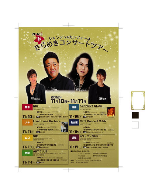 RIO(如月伶生)と江川康人さん(新巴里オーナー)が11月10日(土)より西日本をツアーします。ピアノは新進気鋭の滝野郁瑛さん。シャンソン、カンツオーネ愛好者の方はもちろん、シャンソン、カンツオーネは敷居が高いと思っておられる方々にもきっとご満足いただけることでしょう!各地の皆さんのお出かけお待ちしています。 11月10日(土)熊本CIB 11日(日)別府Harbors 13日(火)山口VIP 14日(水)大阪ART CKUB 15日(木)福井 KENNEDY CLUB 16日(金)名古屋 エルム 17日(土)浜松 カフェ