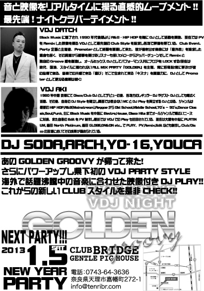 管理人様、告知失礼致します。 【全員入場無料なんですぅ〜】 県下初VDJ PARTY STYLEで 11月3日(土) 23時よりCLUB BRIDGEで開催 海外で話題沸騰中の サウンド+ 映像を操るDJ PLAY 懐かしのあの曲や、最新のヒットチューンまで、 全曲プロモーションビデオを使ってのDJは必見です ぜひその目で最新のVideoDJ Mixを体感してください もちろん今までの人気DJ達もパーティーを イケイケに盛り上げる なんとALL ENTRY FR