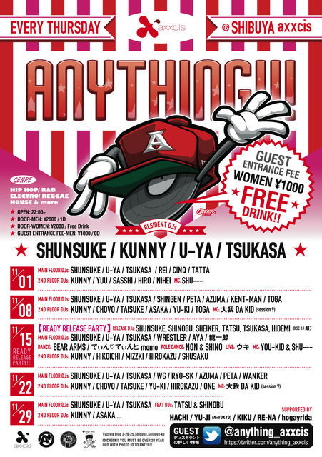 ★☆★☆★☆★☆★☆★☆★☆ ゲストお取り出来ますのでお気軽にメッセージ下さい またはエントランスにて【DJレイのゲストでレイ】 とお伝え頂いても、ゲスト料金でのご入場が可能となりますのでお使い下さい! ゲストをとっていただくと 男性1000円 女性1000円Free Drink にてご入場頂けます ★☆★☆★☆★☆★☆★☆★☆ 渋谷アクシスにて毎週木曜日開催の『ANYTHING』 女性から支持を得続けている当イベントは終日朝まで女性飲み放題 今
