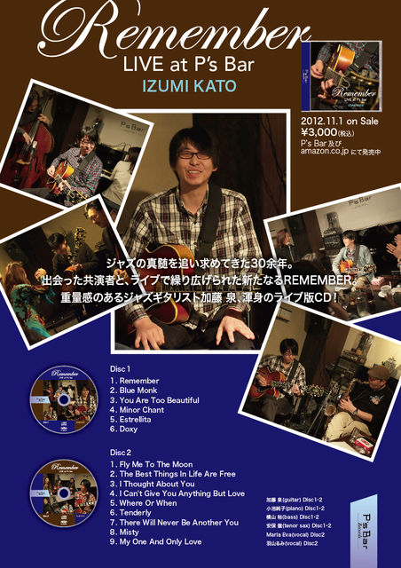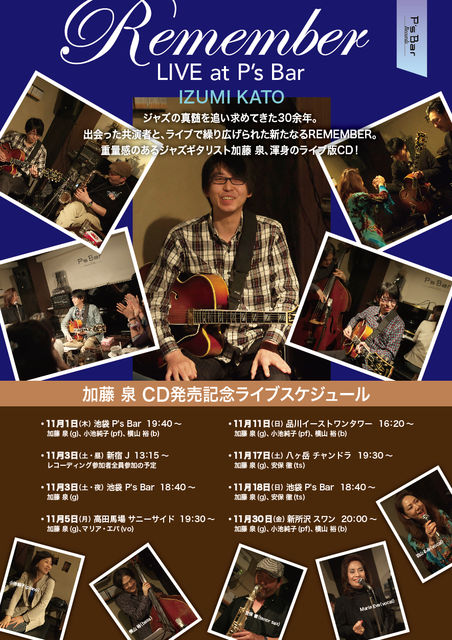 皆さま、いつも本当にお世話になっております。 そして、大変ご無沙汰してしまって、申し訳ありません… じつは、この度11月1日に、私 加藤 泉の3枚目となるリーダーアルバム 【REMEMBER】が、P's Barレーベルより発売されます。 今回は自身初のリーダー・ライブアルバムでもあり、名のあるミュージシャン達、 (TS)安保 徹さん、 (P)小池純子さん、 (B)横山 裕さん (Vo)マリア・エバさん、(Vo)羽山るみさん、 に参加して頂き、お力添えを頂き、とても良いアルバムになりました。 発売に伴いまして、11月中に8回のCD発売記念ラ