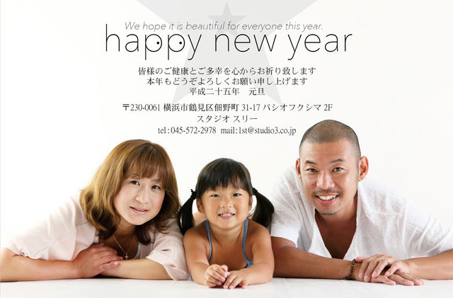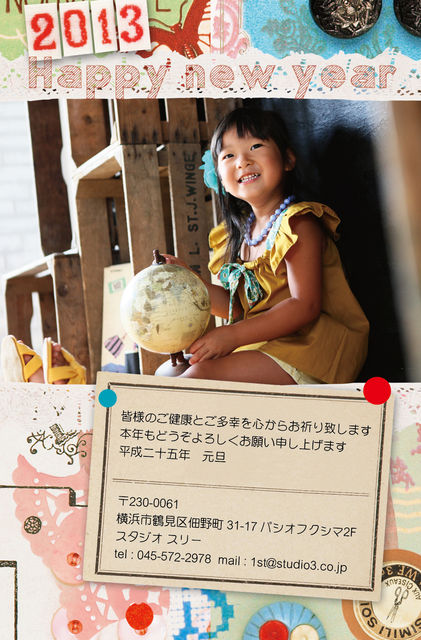 2013年の年賀状どうしようかな〜・・・なんて お悩みの方にぴったりな11月のイベント 11月にご来店のお客様で 当日限定フレームセット(AorB)またはアルバムをご購入の方に、 年賀状のデザインデータをプレゼント致します^^ 撮影させて頂いたお写真から、使用したいカットを選んで頂き、 お好みの年賀状のデザイン等を選んで頂きましたら、 メールにて完成した年賀状用レイアウトデータをお渡し致します。 データでのお渡しなので、ご自身で何枚でも自由にプリントが可能ですよ^^♪ 詳しい内容やデザインは、こちらのス