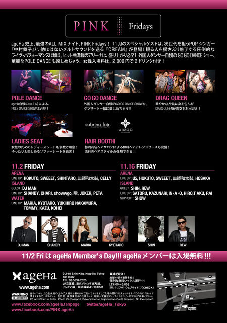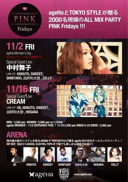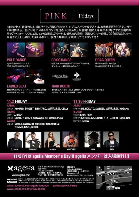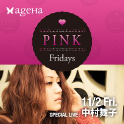 "2012.11.2.Fri. PINK Fridays -supported by TOKYO STYLE 日本最大規模のクラブイベント「ageHa」がおおくりする、1500名規模のBIG PARTY「PINK Fridays」!! ageHa史上、最強のALL MIXナイト、PINK Fridays!今回のスペシャルゲストは、次世代を担うPOPシンガー『中村舞子』が登場!観る人を揺さぶり魅了する圧倒的なライヴ・パフォーマンスを披露。ヒット曲満載のアリーナは、今回も激震の予感。外国人ダンサー自慢のGO GO DANCEショー、華麗なPOLE DANCEも楽しめちゃう。女性入場料は、2,000円で2ドリンク付き! 更に今回はageHaメンバー