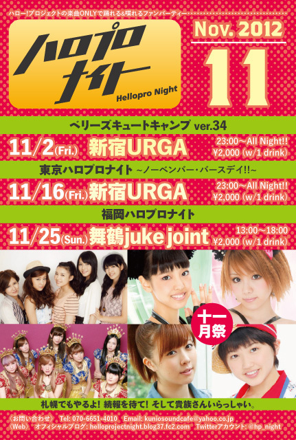 11月開催、新たな一ページを開くこのパーティーに注目! “ベリーズキュートキャンプver.34” 日時:2012年11月2日(金)23:00〜All Night!! 会場:新宿URGA 03-5287-3390 住所:新宿区歌舞伎町2-42-16 第二大滝ビルB1F http://www.urga.net/ 料金:当日2000円(1ドリンク付) DJ:イワオカ少尉/雅サイ軍曹/おくちゃん少佐/クニオ大将/etc. VJ:Honest二等兵 復活ベリー隊長:貴族 ☆出演者は予告なく追加・変更する場合があります。 ベリーズキュートキャンプにとうとうあの男が帰ってくる