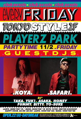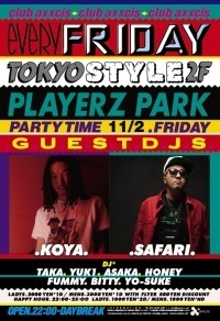 管理人様告知失礼致します。 ************************** ディスカウントご希望の方は、当日渋谷axxcis受付にて 「ビティのゲストでヒロ」 と伝えて頂ければ 1時までに入場→男性1000円/0D、女性1000円/2D 1時以降に入場→男女共1500円/1D でご案内致します。 もちろん個別のゲストもお取りできますので、お気軽にご連絡下さいませ。 *********************** 11/2(FRI)『PLAYERZ PARK』@axxcis OPEN 22:00 GENRE : HIP HOP / R&B / REGGAE / HOUSE / J-POP / AL