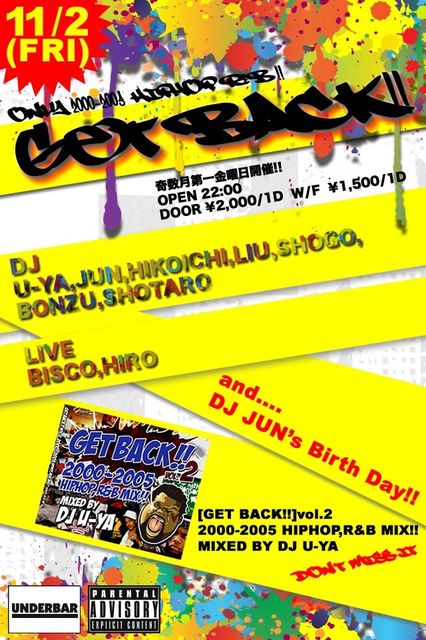 11/2 Fri. GET zBACK "2000-2005's black music only!!" @shibuyaUNDERBAR DJ U-YA GETBACK vol.2 MIX CD RELEASE PARTY DJ JUN's Birthday Bash Entrance:\1,500/1drink 【ボンズのゲストでボンズ】