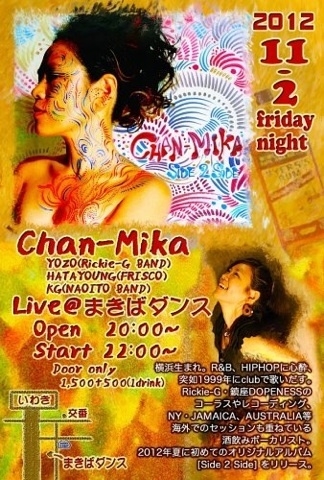 Chan Mikaが今年もいわきに歌いにやってくるよ〜♪ 昨年まきばダンスでチャンミカに惚れちゃった人も、聴き逃した方も、11月2日はChan Mika Liveで楽しもう。 豪華バンドメンバーも一緒です!! guitar:YOZO(Rickie-G BAND) keyboard:HATAYOUNG(FRISCO) percussion:KG(NAOITO BAND) live charge1500円+1ドリンク500円です!! open 20:00 start 22:00
