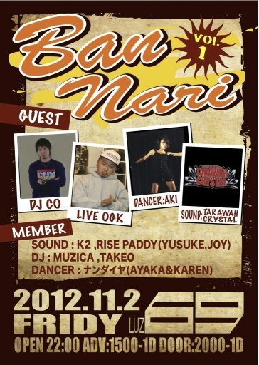 ついにLUZ69にて 開催決定!! (以下オーガナイザー K2より) その名も 【BANNARI Vol.1】 今回は HIPHOPに DJ-CO、O.G.K ReggaeにTARAWAHCRYSTAL Dancerに AKI 間違いないGUESTを お招きしてのVol.1 BANNARI Vol.1 @LUZ69 ■ 2012.11.2 FRIDY ■ OPEN22:00 ■ ADV:1500‐1D ■ DOOR:2000‐1D ■GUEST DJ-CO TARAWAH CRYSTAL O.G.K AKI ■MEMBER ☆SOUND☆ K2 RISEPADDY ☆DJ☆ MUZICA TAKEO ☆DANCER☆ ナンダイヤ BANNARIで、飲んで BANNARIで、踊って BANNARIで、遊