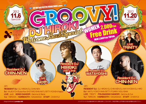 11/6(火)女性¥1000飲み放題!!『GROOVY!』DJ HIROKI Welcome Back Special!!!!!!!@渋谷axxcis 告知失礼致します。 毎月第1第3火曜日恒例、女性\1000飲み放題で大人気のGROOVY! なんと今回は、自身のMIX CDがTSUTAYA等の洋楽セル・レンタルランキングでお馴染みのDJ HIROKIが4ヵ月ぶりにGROOVY!に復帰 もちろんメインタイムはDJ HIROKIスペシャルセットでお届けします 通常2000円かかってしまうところ、 ★★★★★★★★★★★★★★★★★★★★★★ axxcisエントランスに