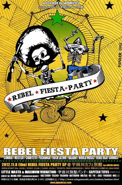 REBEL FIESTA PARTY DJ Set (ROCK LATINO,MESTIZO, CUMBIA, ROOTS REGGAE, SKA, WORLD MUSIC, REBEL BEAT SOUNDS) 毎月恒例のREBEL FIESTA PARTYが、会場を変えて、渋谷の宇田川カフェ別館 (exラヴァーズロック)に出現。毎回多様なゲストを迎え、無国籍のダンス空間を演出する。2009から2011年(3年連続)のフジロックフェスティバル出演や、海外ツアー、MANU CHA