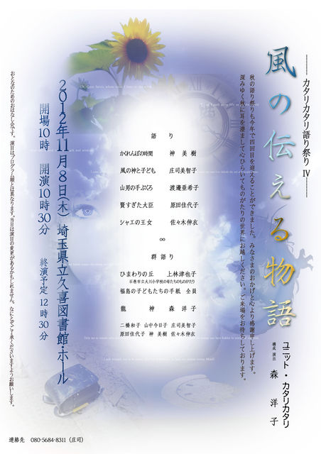 すっかりご無沙汰しております。ユニット・カタリカタリ第四回発表会 みんな 自分のことばで語れるようになりました。 内容は 昔話4話(うち絵本1話)現代小説から1話 今の物語 3話 大川小学校 3.11のものがたり 福島の子どもたちの手紙 龍神 ゲンパツということばなしに原発を語るファンタジー カタリカタリは昔話の伝承と 今のものがたり 今生きたひとたちのものがたりを その喜び 悲しみ 祈り とともに語ってゆきます。 それは語りの力を取り戻すためにもなると信じております。なぜ