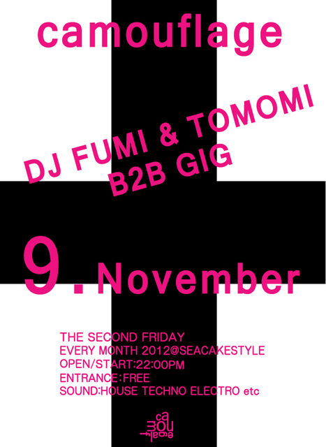 告知失礼します。 ■「camouflage」 SPIRIT MOMのFUMIが新たにSEACAKESTYLEで 毎月第二金曜日お届けする新しい音楽空間!! 今回のカモフラにはHybrid Boogie/大人の遊園地の TOMOMIさんとB2B GIGすることになりました!JAZZから4つうちまで 幅広い音に対応する彼女とB2Bするのは楽しみです! 二人の音楽性がミックスされて上質のものになればうれしいですね! そんな今週金曜のカモフラをお楽しみに! メインは4つ打ちの音楽HOUSE、TECHNO、ELECTROですが JAZZ〜SOUL/FUNKなどの音の要素もブレンドして「camouflage」 独