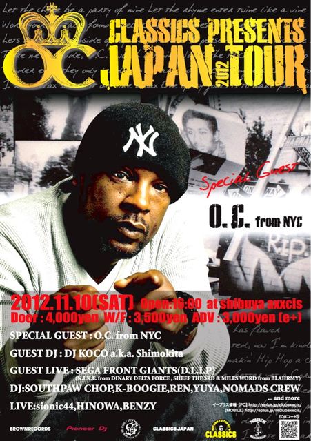openしました!が!まだメッセージ頂ければディスカウントできます! あの、O.C/D.I.T.Cが11/10、来日!!!関東公演 は当イベントの一発のみ! さらにはDJ KOCO a.k.a.Shimokita、D.L.I.PよりSEGA FRONT GIANTSも登場!! ★★チケットを買いそびれても安心!!こちらで、 ★★【超お得なディスカウント】受け付けております。ディスカウント希望の方はメッセージタイトルに『O.C live ディスカウント希望』と入れて、メッセージ欄に、 ※代表者のお名前(ニックネーム等でかまいません。) ※大体の人数 を明記の上、お気軽