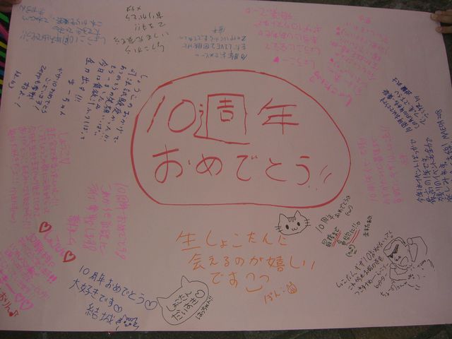コミュニティ管理者様貴重なスペースお借りいたします。 企画内容はいたって単純、参加費 無料 「ギザ10べすと!!中川翔子の音返し(^ω^)」のZeep台場2daysで開演までとライブ後、会場前で集まって雑談して、楽しく過ごそうという内容です 今回も寄せ書きでも書きながらいろいろ雑談したいと思っています 書いた寄せ書きはみんなで写真を撮った後、入場時に僕が責任もってしょこたんに届くよう、プレゼントボックスに入れます 寄せ書きは渋谷でもやったのでその他、素敵な企画案があ
