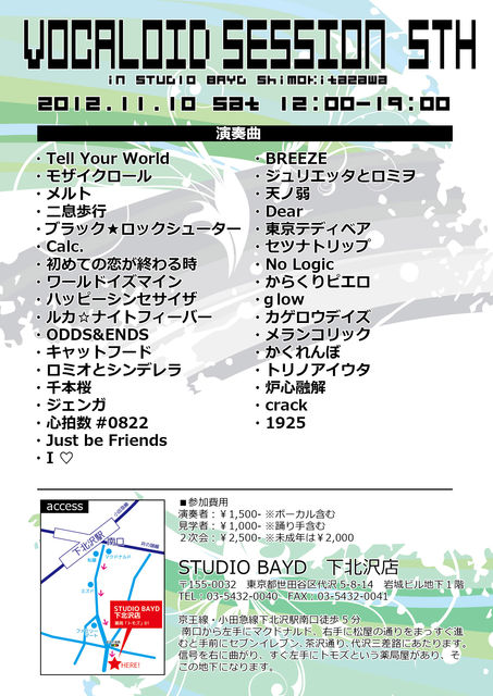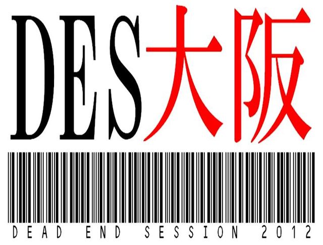 DEAD END SESSION in 大阪 2012 2012年 11月 10日(土) 出戸パンセホール 集合 PM 13:00 本編 PM 14:00 〜 PM 20:00 片付け、撤収 PM 20:00〜PM 20:30 早く終われば切り上げもあり 参加費 ¥2,500+ドリンク代¥500 セッション中の飲み物、フード類はキャッシュオンで 自由に購入していただけますのでそちらもお楽しみください