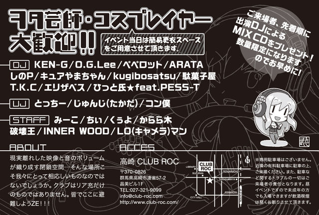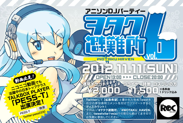 アニソンDJパーティー ヲタク避難所vol.6 -WOTAKU HAVEN - 11月11日(日) open 13:00〜close 20:00 @高崎 CLUB ROC 通常チケット 2000円 フライヤー持参、コスプレの方 1500円 (各料金1ドリンク付き) その他割引について... Twitterにて【拡散希望】と書かれた告知Tweetに自分の参加表明コメントを付けてリツイートすると割引き!タグは→ #ヲタク避難所 、 #WOTAKU_HAVEN また、tweetviteやmixiでの割引きも続けてますのでお気軽に参加してください♬ ご来場者、先着順に出演DJによるMIX CDをプレゼント!数量限定で