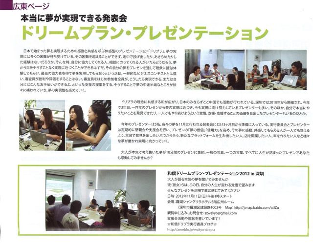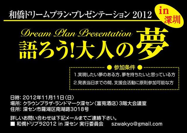 こんにちは! 深セン和僑会の梅山です 11月11日(日)、深セン和僑会で今年最大のイベントである 「和僑ドリームプラン・プレゼンテーション」が開催されます このイベントは私達にとって強い思い入れがあります それはなぜか? 参加する誰もが、感動、勇気、共感といった、 普通だったら恥ずかしくて言えないような言葉を、言いたくなってしまう そんな魅力があるからです 一昨年、初めて深センでドリプラを開催した時、ゲストで来て頂いた 福島正伸さん、鶴岡秀子さん。上場していく会社をいくつもコンサルタントされたり、