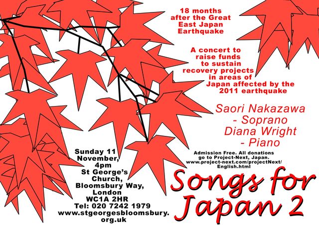 東日本大震災支援チャリティコンサート Songs for Japan 2 日時 11月11日(日) 午後4時開演 (午後3時半開場) 場所 St George’s Church Bloomsbury Way London WC1 2HR www.stgeorgesbloomsbury.org.uk 最寄り駅 Holborn / Tottenham Court Road 出演者 中澤砂織 ソプラノ Diana Wright ピアノ プログラム 日本歌曲 イギリス、アイルランド民謡、オペラアリア、アイヴァーノヴェロの楽曲等。 入場無料 当日会場に募金箱を設置いたします。ご協力頂いた義援金は全て