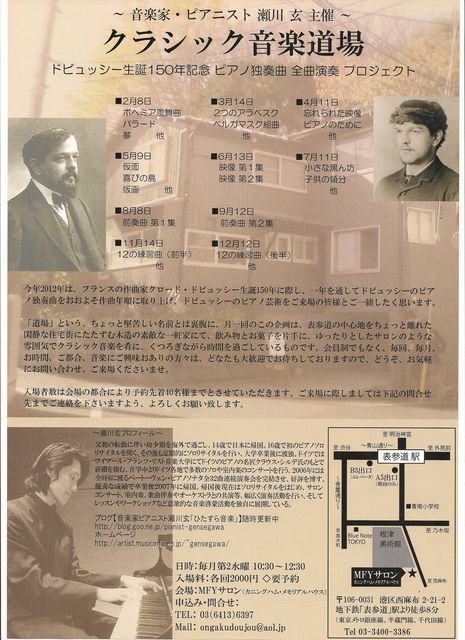 クラシック音楽道場 表参道の中心地からちょっと離れたところにある 素敵な木造の一軒屋。 居心地の良い素敵な空間。 瀬川さんの素敵な音楽と楽しいお話を聴きにいらっしゃいませんか? 2月より ◆ドビュッシー生誕150年記念ピアノ独奏曲全曲演奏プロジェクト◆ 開催中 http://artist.musicinfo.co.jp/~gensegawa/zalle%20doujou.htm