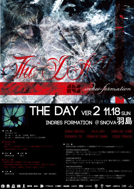 今年もやってきました!!! 「THE DAY」 ride with INDRES!! 去年大盛り上がりだったあのイベントを今年も開催いたします★★ 【申込先】 ?お電話 SNOVA 羽島:058-394-0251 ?Mail SNOVA 羽島:snova2@h-cosmo.co.jp 件名:『THE DAY ver.2参加』 本文:『お名前』 『連絡先』 を記入してください。 ?Riderへ連絡 参加するRiderへ連絡して頂いてもかまいません。 ーーーーーーーーーー概要ーーーーーーーーーー ◆ 日時 ◆ 11 月 18 日(日) 16:30 ~ 19:30 (3 時間 貸切り) ◆ 滑走料金